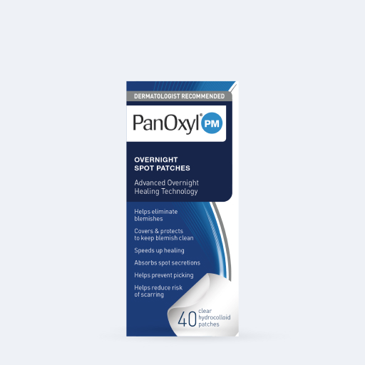 When the zit has got. to. go. and fast. PanOxyl PM Overnight Spot Patches help eliminate blemishes by absorbing pus and fluids for faster healing. These latex-free hydrocolloid patches are safe for all skin types and designed to help protect skin, heal spots and prevent picking, which can lead to scarring. They’re just a little thicker than some other acne dots, so they protect your blemish better and can absorb more pus and fluids. Each box contains 40 patches in two sizes, 9mm and 12mm. PanOxyl Spot Patches contain no parabens, no fragrances, no sulfates, no dyes and no latex. To use, cleanse and dry skin. Select the patch size that covers your spot, then apply and leave on overnight. In the morning, slowly remove the patch. Cleanse and dry the affected area, and tackle the day with confidence.